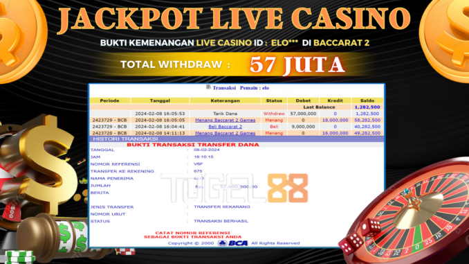 TOGEL88 JACKPOT LIVE CASINO DI BACCARAT 2 Rp 57.000.000,- LUNAS
