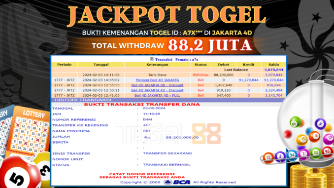 MEMBER TOGEL88 MENERIMA PELUNASAN JACKPOT TOGEL JAKARTA 4D Rp 88.200.000,- LUNAS