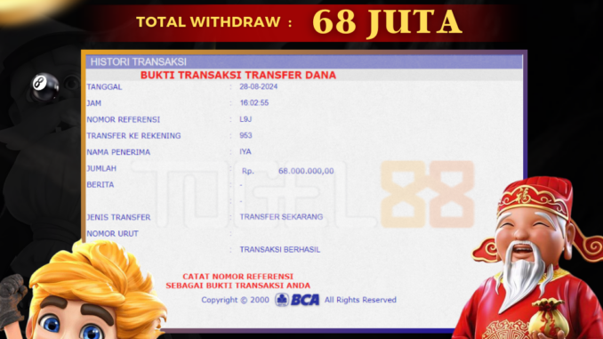 TOGEL88 mengucapkan selamat kepada user id : IYA*** yang telah berhasil mendapatkan jackpot pada permainan SLOT DI ZEUS SPIN ROYAL. Kemenangan sebesar Rp 68.000.000,-. telah dibayarkan LUNAS oleh pihak TOGEL88 kepada pemilik user id setelah yang bersangkutan mengisi formulir withdraw. Proses pencairan dana berlangsung sangat cepat hanya dalam waktu 5-10 menit sudah berada dalam rekening pemilik user id. Bukti transfer yang dapat anda lihat adalah bukti SAH / VALID yang langsung di dapatkan melalui bukti transaksi dari Bank yang digunakan untuk pengiriman dana pada rekening pemilik user id. Terima kasih kami sampaikan kepada para pengguna setia TOGEL88 yang telah menggunakan situs kami, sebagai Bandar Terpercaya yang pastinya membayar semua kemenangan member hingga lunas. Apakah TOGEL88 PENIPU ? Reputasi “TOGEL88 TERPERCAYA” sudah sangat melekat. puluhan hingga ratusan ribu pengguna setia TOGEL88 tetap menggunakan situs terbesar dan terbaik di Indonesia ini. Hapus rasa was-was dan khawatir anda, kemenangan anda berapapun PASTI dibayarkan hingga lunas.