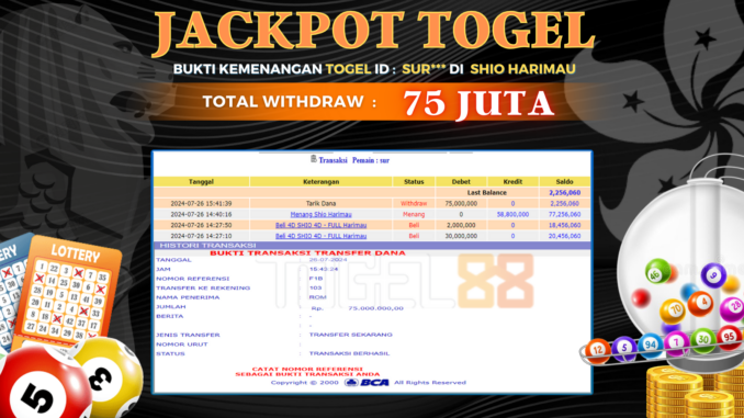 MEMBER TOGEL88 MENERIMA PELUNASAN JACKPOT TOGEL DI SHIO HARIMAU Rp 75.000.000,- LUNAS
