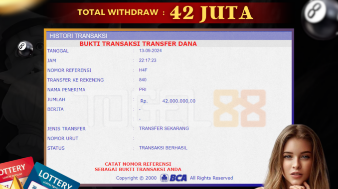 TOGEL88 mengucapkan selamat kepada user id : PRI*** yang telah berhasil mendapatkan jackpot pada permainan TOGEL DI SHIO KELINCI. Kemenangan sebesar Rp 42.000.000,-. telah dibayarkan LUNAS oleh pihak TOGEL88 kepada pemilik user id setelah yang bersangkutan mengisi formulir withdraw. Proses pencairan dana berlangsung sangat cepat hanya dalam waktu 5-10 menit sudah berada dalam rekening pemilik user id. Bukti transfer yang dapat anda lihat adalah bukti SAH / VALID yang langsung di dapatkan melalui bukti transaksi dari Bank yang digunakan untuk pengiriman dana pada rekening pemilik user id. Terima kasih kami sampaikan kepada para pengguna setia TOGEL88 yang telah menggunakan situs kami, sebagai Bandar Terpercaya yang pastinya membayar semua kemenangan member hingga lunas. Apakah TOGEL88 PENIPU ? Reputasi “TOGEL88 TERPERCAYA” sudah sangat melekat. puluhan hingga ratusan ribu pengguna setia TOGEL88 tetap menggunakan situs terbesar dan terbaik di Indonesia ini. Hapus rasa was-was dan khawatir anda, kemenangan anda berapapun PASTI dibayarkan hingga lunas.