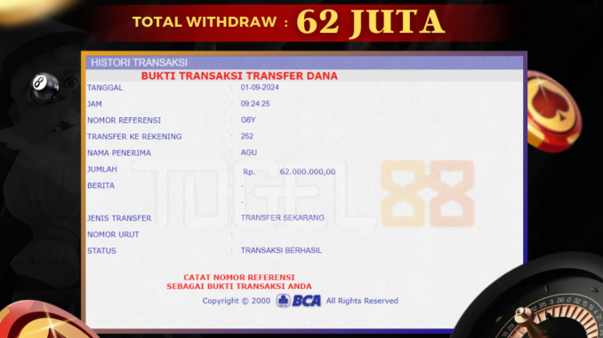 TOGEL88 mengucapkan selamat kepada user id : AGU*** yang telah berhasil mendapatkan jackpot pada permainan LIVE CASINO DI ROULETTE. Kemenangan sebesar Rp 62.000.000,-. telah dibayarkan LUNAS oleh pihak TOGEL88 kepada pemilik user id setelah yang bersangkutan mengisi formulir withdraw. Proses pencairan dana berlangsung sangat cepat hanya dalam waktu 5-10 menit sudah berada dalam rekening pemilik user id. Bukti transfer yang dapat anda lihat adalah bukti SAH / VALID yang langsung di dapatkan melalui bukti transaksi dari Bank yang digunakan untuk pengiriman dana pada rekening pemilik user id. Terima kasih kami sampaikan kepada para pengguna setia TOGEL88 yang telah menggunakan situs kami, sebagai Bandar Terpercaya yang pastinya membayar semua kemenangan member hingga lunas. Apakah TOGEL88 PENIPU ? Reputasi “TOGEL88 TERPERCAYA” sudah sangat melekat. puluhan hingga ratusan ribu pengguna setia TOGEL88 tetap menggunakan situs terbesar dan terbaik di Indonesia ini. Hapus rasa was-was dan khawatir anda, kemenangan anda berapapun PASTI dibayarkan hingga lunas.