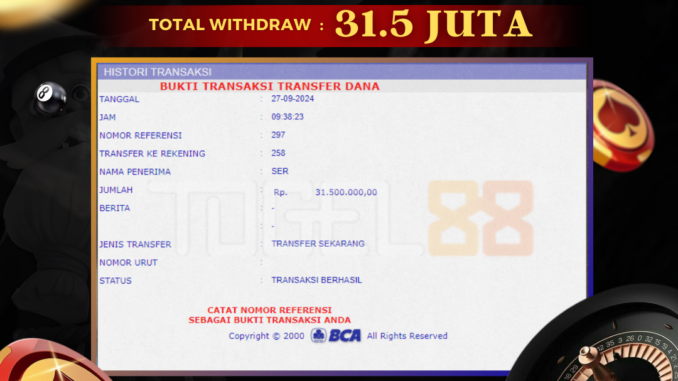 TOGEL88 mengucapkan selamat kepada user id : SER*** yang telah berhasil mendapatkan jackpot pada permainan LIVE CASINO DI ROULETTE. Kemenangan sebesar Rp 31.500.000,-. telah dibayarkan LUNAS oleh pihak TOGEL88 kepada pemilik user id setelah yang bersangkutan mengisi formulir withdraw. Proses pencairan dana berlangsung sangat cepat hanya dalam waktu 5-10 menit sudah berada dalam rekening pemilik user id. Bukti transfer yang dapat anda lihat adalah bukti SAH / VALID yang langsung di dapatkan melalui bukti transaksi dari Bank yang digunakan untuk pengiriman dana pada rekening pemilik user id. Terima kasih kami sampaikan kepada para pengguna setia TOGEL88 yang telah menggunakan situs kami, sebagai Bandar Terpercaya yang pastinya membayar semua kemenangan member hingga lunas. Apakah TOGEL88 PENIPU ? Reputasi “TOGEL88 TERPERCAYA” sudah sangat melekat. puluhan hingga ratusan ribu pengguna setia TOGEL88 tetap menggunakan situs terbesar dan terbaik di Indonesia ini. Hapus rasa was-was dan khawatir anda, kemenangan anda berapapun PASTI dibayarkan hingga lunas.