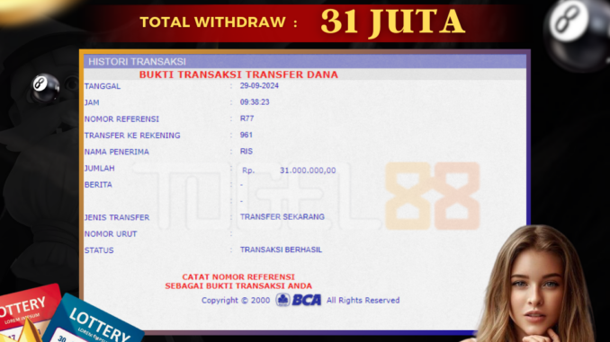 TOGEL88 mengucapkan selamat kepada user id : RIS*** yang telah berhasil mendapatkan jackpot pada permainan TOGEL DI JOWOPOOLS . Kemenangan sebesar Rp 31.000.000,-. telah dibayarkan LUNAS oleh pihak TOGEL88 kepada pemilik user id setelah yang bersangkutan mengisi formulir withdraw. Proses pencairan dana berlangsung sangat cepat hanya dalam waktu 5-10 menit sudah berada dalam rekening pemilik user id. Bukti transfer yang dapat anda lihat adalah bukti SAH / VALID yang langsung di dapatkan melalui bukti transaksi dari Bank yang digunakan untuk pengiriman dana pada rekening pemilik user id. Terima kasih kami sampaikan kepada para pengguna setia TOGEL88 yang telah menggunakan situs kami, sebagai Bandar Terpercaya yang pastinya membayar semua kemenangan member hingga lunas. Apakah TOGEL88 PENIPU ? Reputasi “TOGEL88 TERPERCAYA” sudah sangat melekat. puluhan hingga ratusan ribu pengguna setia TOGEL88 tetap menggunakan situs terbesar dan terbaik di Indonesia ini. Hapus rasa was-was dan khawatir anda, kemenangan anda berapapun PASTI dibayarkan hingga lunas.