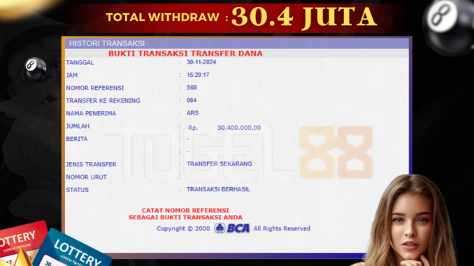 TOGEL88 mengucapkan selamat kepada user id : ARS*** yang telah berhasil mendapatkan jackpot pada permainan TOGEL DI TOTO MACAU 4D. Kemenangan sebesar Rp 30.400.000,-. telah dibayarkan LUNAS oleh pihak TOGEL88 kepada pemilik user id setelah yang bersangkutan mengisi formulir withdraw. Proses pencairan dana berlangsung sangat cepat hanya dalam waktu 5-10 menit sudah berada dalam rekening pemilik user id. Bukti transfer yang dapat anda lihat adalah bukti SAH / VALID yang langsung di dapatkan melalui bukti transaksi dari Bank yang digunakan untuk pengiriman dana pada rekening pemilik user id. Terima kasih kami sampaikan kepada para pengguna setia TOGEL88 yang telah menggunakan situs kami, sebagai Bandar Terpercaya yang pastinya membayar semua kemenangan member hingga lunas. Apakah TOGEL88 PENIPU ? Reputasi “TOGEL88 TERPERCAYA” sudah sangat melekat. puluhan hingga ratusan ribu pengguna setia TOGEL88 tetap menggunakan situs terbesar dan terbaik di Indonesia ini. Hapus rasa was-was dan khawatir anda, kemenangan anda berapapun PASTI dibayarkan hingga lunas.