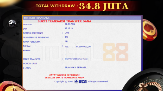 TOGEL88 mengucapkan selamat kepada user id : NAR*** yang telah berhasil mendapatkan jackpot pada permainan LIVE CASINO DI SHIO FIGHT. Kemenangan sebesar Rp 34.800.000,-. telah dibayarkan LUNAS oleh pihak TOGEL88 kepada pemilik user id setelah yang bersangkutan mengisi formulir withdraw. Proses pencairan dana berlangsung sangat cepat hanya dalam waktu 5-10 menit sudah berada dalam rekening pemilik user id. Bukti transfer yang dapat anda lihat adalah bukti SAH / VALID yang langsung di dapatkan melalui bukti transaksi dari Bank yang digunakan untuk pengiriman dana pada rekening pemilik user id. Terima kasih kami sampaikan kepada para pengguna setia TOGEL88 yang telah menggunakan situs kami, sebagai Bandar Terpercaya yang pastinya membayar semua kemenangan member hingga lunas. Apakah TOGEL88 PENIPU ? Reputasi “TOGEL88 TERPERCAYA” sudah sangat melekat. puluhan hingga ratusan ribu pengguna setia TOGEL88 tetap menggunakan situs terbesar dan terbaik di Indonesia ini. Hapus rasa was-was dan khawatir anda, kemenangan anda berapapun PASTI dibayarkan hingga lunas.