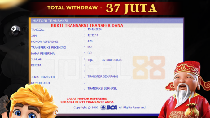 TOGEL88 mengucapkan selamat kepada user id : CRI*** yang telah berhasil mendapatkan jackpot pada permainan SLOT DI AZTEC GEMS. Kemenangan sebesar Rp 37.000.000,-. telah dibayarkan LUNAS oleh pihak TOGEL88 kepada pemilik user id setelah yang bersangkutan mengisi formulir withdraw. Proses pencairan dana berlangsung sangat cepat hanya dalam waktu 5-10 menit sudah berada dalam rekening pemilik user id. Bukti transfer yang dapat anda lihat adalah bukti SAH / VALID yang langsung di dapatkan melalui bukti transaksi dari Bank yang digunakan untuk pengiriman dana pada rekening pemilik user id. Terima kasih kami sampaikan kepada para pengguna setia TOGEL88 yang telah menggunakan situs kami, sebagai Bandar Terpercaya yang pastinya membayar semua kemenangan member hingga lunas. Apakah TOGEL88 PENIPU ? Reputasi “TOGEL88 TERPERCAYA” sudah sangat melekat. puluhan hingga ratusan ribu pengguna setia TOGEL88 tetap menggunakan situs terbesar dan terbaik di Indonesia ini. Hapus rasa was-was dan khawatir anda, kemenangan anda berapapun PASTI dibayarkan hingga lunas.
