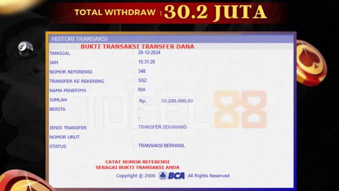 TOGEL88 mengucapkan selamat kepada user id : RIA*** yang telah berhasil mendapatkan jackpot pada permainan LIVE CASINO DI SHIO FIGHT. Kemenangan sebesar Rp 30.200.000,-. telah dibayarkan LUNAS oleh pihak TOGEL88 kepada pemilik user id setelah yang bersangkutan mengisi formulir withdraw. Proses pencairan dana berlangsung sangat cepat hanya dalam waktu 5-10 menit sudah berada dalam rekening pemilik user id. Bukti transfer yang dapat anda lihat adalah bukti SAH / VALID yang langsung di dapatkan melalui bukti transaksi dari Bank yang digunakan untuk pengiriman dana pada rekening pemilik user id. Terima kasih kami sampaikan kepada para pengguna setia TOGEL88 yang telah menggunakan situs kami, sebagai Bandar Terpercaya yang pastinya membayar semua kemenangan member hingga lunas. Apakah TOGEL88 PENIPU ? Reputasi “TOGEL88 TERPERCAYA” sudah sangat melekat. puluhan hingga ratusan ribu pengguna setia TOGEL88 tetap menggunakan situs terbesar dan terbaik di Indonesia ini. Hapus rasa was-was dan khawatir anda, kemenangan anda berapapun PASTI dibayarkan hingga lunas.