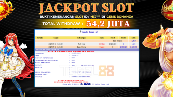 MEMBER TOGEL88 MENERIMA PELUNASAN JACKPOT SLOT di GEMS BONANZA Rp 54.200.000,- LUNAS