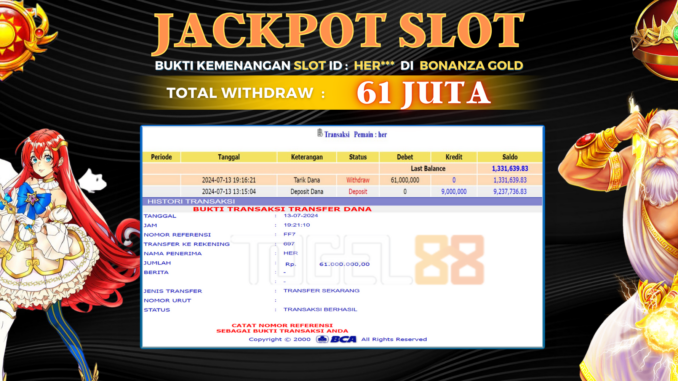 MEMBER TOGEL88 MENERIMA PELUNASAN JACKPOT SLOT DI BONANZA GOLD Rp 61.000.000,- LUNAS