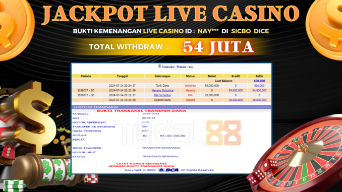 TOGEL88 JACKPOT LIVE CASINO di SICBO DICE Rp 54.000.000,- LUNAS