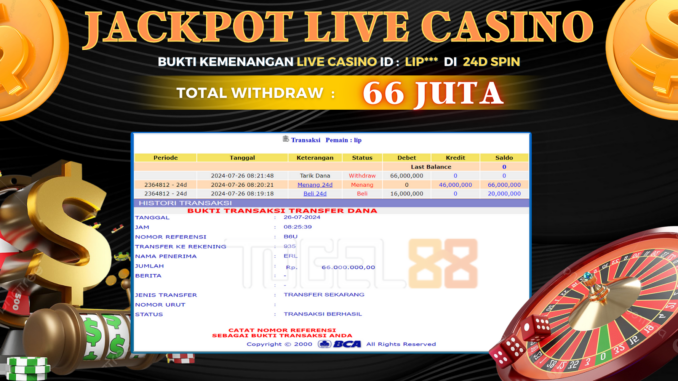 TOGEL88 JACKPOT LIVE CASINO DI 24D SPIN Rp 66.000.000,- LUNAS