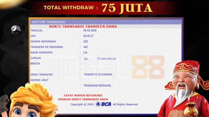 TOGEL88 mengucapkan selamat kepada user id : PUR*** yang telah berhasil mendapatkan jackpot pada permainan SLOT DI MAHJONG BONANZA . Kemenangan sebesar Rp 75.000.000,-. telah dibayarkan LUNAS oleh pihak TOGEL88 kepada pemilik user id setelah yang bersangkutan mengisi formulir withdraw. Proses pencairan dana berlangsung sangat cepat hanya dalam waktu 5-10 menit sudah berada dalam rekening pemilik user id. Bukti transfer yang dapat anda lihat adalah bukti SAH / VALID yang langsung di dapatkan melalui bukti transaksi dari Bank yang digunakan untuk pengiriman dana pada rekening pemilik user id. Terima kasih kami sampaikan kepada para pengguna setia TOGEL88 yang telah menggunakan situs kami, sebagai Bandar Terpercaya yang pastinya membayar semua kemenangan member hingga lunas. Apakah TOGEL88 PENIPU ? Reputasi “TOGEL88 TERPERCAYA” sudah sangat melekat. puluhan hingga ratusan ribu pengguna setia TOGEL88 tetap menggunakan situs terbesar dan terbaik di Indonesia ini. Hapus rasa was-was dan khawatir anda, kemenangan anda berapapun PASTI dibayarkan hingga lunas.