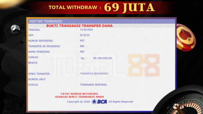 TOGEL88 mengucapkan selamat kepada user id : FOY*** yang telah berhasil mendapatkan jackpot pada permainan LIVE CASINO DI DUEL DICE. Kemenangan sebesar Rp 69.000.000,-. telah dibayarkan LUNAS oleh pihak TOGEL88 kepada pemilik user id setelah yang bersangkutan mengisi formulir withdraw. Proses pencairan dana berlangsung sangat cepat hanya dalam waktu 5-10 menit sudah berada dalam rekening pemilik user id. Bukti transfer yang dapat anda lihat adalah bukti SAH / VALID yang langsung di dapatkan melalui bukti transaksi dari Bank yang digunakan untuk pengiriman dana pada rekening pemilik user id. Terima kasih kami sampaikan kepada para pengguna setia TOGEL88 yang telah menggunakan situs kami, sebagai Bandar Terpercaya yang pastinya membayar semua kemenangan member hingga lunas. Apakah TOGEL88 PENIPU ? Reputasi “TOGEL88 TERPERCAYA” sudah sangat melekat. puluhan hingga ratusan ribu pengguna setia TOGEL88 tetap menggunakan situs terbesar dan terbaik di Indonesia ini. Hapus rasa was-was dan khawatir anda, kemenangan anda berapapun PASTI dibayarkan hingga lunas.