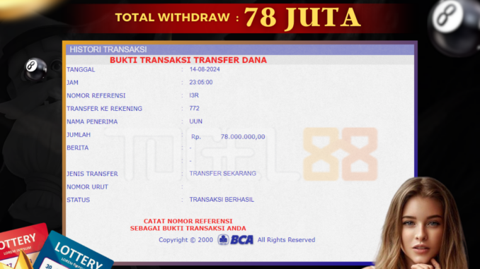 TOGEL88 mengucapkan selamat kepada user id : AJI*** yang telah berhasil mendapatkan jackpot pada permainan TOGEL DI HONGKONG POOLS. Kemenangan sebesar Rp 78.000.000,-. telah dibayarkan LUNAS oleh pihak TOGEL88 kepada pemilik user id setelah yang bersangkutan mengisi formulir withdraw. Proses pencairan dana berlangsung sangat cepat hanya dalam waktu 5-10 menit sudah berada dalam rekening pemilik user id. Bukti transfer yang dapat anda lihat adalah bukti SAH / VALID yang langsung di dapatkan melalui bukti transaksi dari Bank yang digunakan untuk pengiriman dana pada rekening pemilik user id. Terima kasih kami sampaikan kepada para pengguna setia TOGEL88 yang telah menggunakan situs kami, sebagai Bandar Terpercaya yang pastinya membayar semua kemenangan member hingga lunas. Apakah TOGEL88 PENIPU ? Reputasi “TOGEL88 TERPERCAYA” sudah sangat melekat. puluhan hingga ratusan ribu pengguna setia TOGEL88 tetap menggunakan situs terbesar dan terbaik di Indonesia ini. Hapus rasa was-was dan khawatir anda, kemenangan anda berapapun PASTI dibayarkan hingga lunas.