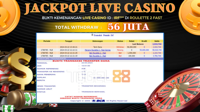 TOGEL88 JACKPOT LIVE CASINO DI ROULETTE 2 FAST Rp 56.000.000,- LUNAS
