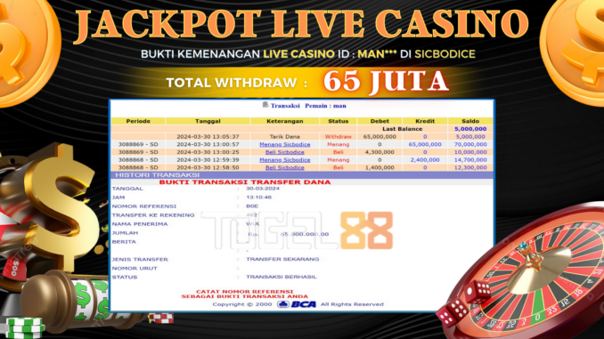 MEMBER TOGEL88 MENERIMA PELUNASAN KEMENANGAN JACKPOT LIVE CASINO DI SICBO DICE Rp 65.000.000,- LUNAS
