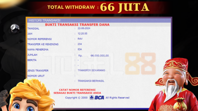 TOGEL88 mengucapkan selamat kepada user id : 1DA*** yang telah berhasil mendapatkan jackpot pada permainan SLOT DI KOI GATE. Kemenangan sebesar Rp 66.000.000,-. telah dibayarkan LUNAS oleh pihak TOGEL88 kepada pemilik user id setelah yang bersangkutan mengisi formulir withdraw. Proses pencairan dana berlangsung sangat cepat hanya dalam waktu 5-10 menit sudah berada dalam rekening pemilik user id. Bukti transfer yang dapat anda lihat adalah bukti SAH / VALID yang langsung di dapatkan melalui bukti transaksi dari Bank yang digunakan untuk pengiriman dana pada rekening pemilik user id. Terima kasih kami sampaikan kepada para pengguna setia TOGEL88 yang telah menggunakan situs kami, sebagai Bandar Terpercaya yang pastinya membayar semua kemenangan member hingga lunas. Apakah TOGEL88 PENIPU ? Reputasi “TOGEL88 TERPERCAYA” sudah sangat melekat. puluhan hingga ratusan ribu pengguna setia TOGEL88 tetap menggunakan situs terbesar dan terbaik di Indonesia ini. Hapus rasa was-was dan khawatir anda, kemenangan anda berapapun PASTI dibayarkan hingga lunas.