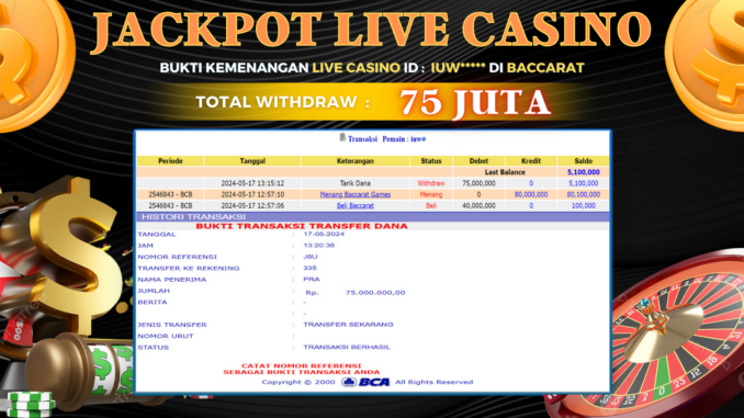 TOGEL88 JACKPOT LIVE CASINO DI BACCARAT Rp 75.000.000,- LUNAS