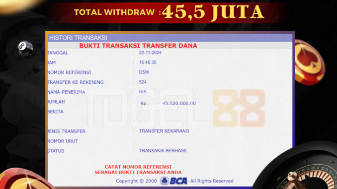 TOGEL88 mengucapkan selamat kepada user id : RGT*** yang telah berhasil mendapatkan jackpot pada permainan TOGEL DI LATO LATO 5D. Kemenangan sebesar Rp 45.500.000,-. telah dibayarkan LUNAS oleh pihak TOGEL88 kepada pemilik user id setelah yang bersangkutan mengisi formulir withdraw. Proses pencairan dana berlangsung sangat cepat hanya dalam waktu 5-10 menit sudah berada dalam rekening pemilik user id. Bukti transfer yang dapat anda lihat adalah bukti SAH / VALID yang langsung di dapatkan melalui bukti transaksi dari Bank yang digunakan untuk pengiriman dana pada rekening pemilik user id. Terima kasih kami sampaikan kepada para pengguna setia TOGEL88 yang telah menggunakan situs kami, sebagai Bandar Terpercaya yang pastinya membayar semua kemenangan member hingga lunas. Apakah TOGEL88 PENIPU ? Reputasi “TOGEL88 TERPERCAYA” sudah sangat melekat. puluhan hingga ratusan ribu pengguna setia TOGEL88 tetap menggunakan situs terbesar dan terbaik di Indonesia ini. Hapus rasa was-was dan khawatir anda, kemenangan anda berapapun PASTI dibayarkan hingga lunas.
