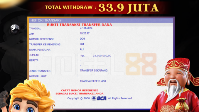 TOGEL88 mengucapkan selamat kepada user id : ALI*** yang telah berhasil mendapatkan jackpot pada permainan SLOT DI SWEET BONANZA. Kemenangan sebesar Rp 33.900.000,-. telah dibayarkan LUNAS oleh pihak TOGEL88 kepada pemilik user id setelah yang bersangkutan mengisi formulir withdraw. Proses pencairan dana berlangsung sangat cepat hanya dalam waktu 5-10 menit sudah berada dalam rekening pemilik user id. Bukti transfer yang dapat anda lihat adalah bukti SAH / VALID yang langsung di dapatkan melalui bukti transaksi dari Bank yang digunakan untuk pengiriman dana pada rekening pemilik user id. Terima kasih kami sampaikan kepada para pengguna setia TOGEL88 yang telah menggunakan situs kami, sebagai Bandar Terpercaya yang pastinya membayar semua kemenangan member hingga lunas. Apakah TOGEL88 PENIPU ? Reputasi “TOGEL88 TERPERCAYA” sudah sangat melekat. puluhan hingga ratusan ribu pengguna setia TOGEL88 tetap menggunakan situs terbesar dan terbaik di Indonesia ini. Hapus rasa was-was dan khawatir anda, kemenangan anda berapapun PASTI dibayarkan hingga lunas.