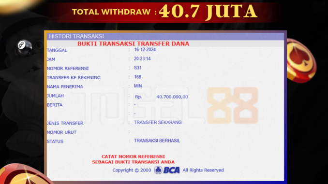 TOGEL88 mengucapkan selamat kepada user id : DIO*** yang telah berhasil mendapatkan jackpot pada permainan LIVE CASINO DI SICBO DICE. Kemenangan sebesar Rp 40.700.000,-. telah dibayarkan LUNAS oleh pihak TOGEL88 kepada pemilik user id setelah yang bersangkutan mengisi formulir withdraw. Proses pencairan dana berlangsung sangat cepat hanya dalam waktu 5-10 menit sudah berada dalam rekening pemilik user id. Bukti transfer yang dapat anda lihat adalah bukti SAH / VALID yang langsung di dapatkan melalui bukti transaksi dari Bank yang digunakan untuk pengiriman dana pada rekening pemilik user id. Terima kasih kami sampaikan kepada para pengguna setia TOGEL88 yang telah menggunakan situs kami, sebagai Bandar Terpercaya yang pastinya membayar semua kemenangan member hingga lunas. Apakah TOGEL88 PENIPU ? Reputasi “TOGEL88 TERPERCAYA” sudah sangat melekat. puluhan hingga ratusan ribu pengguna setia TOGEL88 tetap menggunakan situs terbesar dan terbaik di Indonesia ini. Hapus rasa was-was dan khawatir anda, kemenangan anda berapapun PASTI dibayarkan hingga lunas.