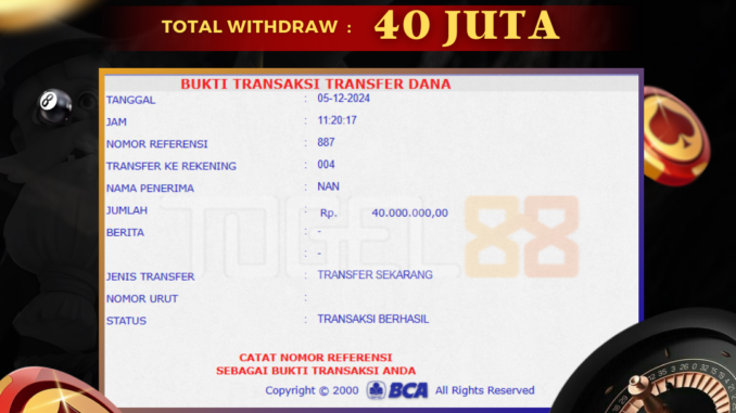TOGEL88 mengucapkan selamat kepada user id : NAN*** yang telah berhasil mendapatkan jackpot pada permainan LIVE CASINO DI ROULETTE. Kemenangan sebesar Rp 40.000.000,-. telah dibayarkan LUNAS oleh pihak TOGEL88 kepada pemilik user id setelah yang bersangkutan mengisi formulir withdraw. Proses pencairan dana berlangsung sangat cepat hanya dalam waktu 5-10 menit sudah berada dalam rekening pemilik user id. Bukti transfer yang dapat anda lihat adalah bukti SAH / VALID yang langsung di dapatkan melalui bukti transaksi dari Bank yang digunakan untuk pengiriman dana pada rekening pemilik user id. Terima kasih kami sampaikan kepada para pengguna setia TOGEL88 yang telah menggunakan situs kami, sebagai Bandar Terpercaya yang pastinya membayar semua kemenangan member hingga lunas. Apakah TOGEL88 PENIPU ? Reputasi “TOGEL88 TERPERCAYA” sudah sangat melekat. puluhan hingga ratusan ribu pengguna setia TOGEL88 tetap menggunakan situs terbesar dan terbaik di Indonesia ini. Hapus rasa was-was dan khawatir anda, kemenangan anda berapapun PASTI dibayarkan hingga lunas.