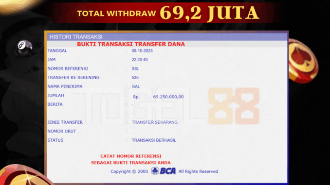 TOGEL88 mengucapkan selamat kepada user id : OLA*** yang telah berhasil mendapatkan jackpot pada permainan LIVE CASINO DI 48D. Kemenangan sebesar Rp 69.250.000,-. telah dibayarkan LUNAS oleh pihak TOGEL88 kepada pemilik user id setelah yang bersangkutan mengisi formulir withdraw. Proses pencairan dana berlangsung sangat cepat hanya dalam waktu 5-10 menit sudah berada dalam rekening pemilik user id. Bukti transfer yang dapat anda lihat adalah bukti SAH / VALID yang langsung di dapatkan melalui bukti transaksi dari Bank yang digunakan untuk pengiriman dana pada rekening pemilik user id. Terima kasih kami sampaikan kepada para pengguna setia TOGEL88 yang telah menggunakan situs kami, sebagai Bandar Terpercaya yang pastinya membayar semua kemenangan member hingga lunas. Apakah TOGEL88 PENIPU ? Reputasi “TOGEL88 TERPERCAYA” sudah sangat melekat. puluhan hingga ratusan ribu pengguna setia TOGEL88 tetap menggunakan situs terbesar dan terbaik di Indonesia ini. Hapus rasa was-was dan khawatir anda, kemenangan anda berapapun PASTI dibayarkan hingga lunas.