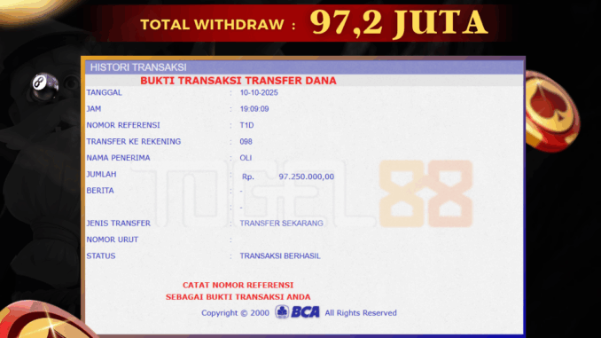 TOGEL88 mengucapkan selamat kepada user id : ATE*** yang telah berhasil mendapatkan jackpot pada permainan LIVE CASINO DI 48D. Kemenangan sebesar Rp 97.250.000,-. telah dibayarkan LUNAS oleh pihak TOGEL88 kepada pemilik user id setelah yang bersangkutan mengisi formulir withdraw. Proses pencairan dana berlangsung sangat cepat hanya dalam waktu 5-10 menit sudah berada dalam rekening pemilik user id. Bukti transfer yang dapat anda lihat adalah bukti SAH / VALID yang langsung di dapatkan melalui bukti transaksi dari Bank yang digunakan untuk pengiriman dana pada rekening pemilik user id. Terima kasih kami sampaikan kepada para pengguna setia TOGEL88 yang telah menggunakan situs kami, sebagai Bandar Terpercaya yang pastinya membayar semua kemenangan member hingga lunas. Apakah TOGEL88 PENIPU ? Reputasi “TOGEL88 TERPERCAYA” sudah sangat melekat. puluhan hingga ratusan ribu pengguna setia TOGEL88 tetap menggunakan situs terbesar dan terbaik di Indonesia ini. Hapus rasa was-was dan khawatir anda, kemenangan anda berapapun PASTI dibayarkan hingga lunas.