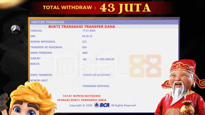 TOGEL88 mengucapkan selamat kepada user id : OJA*** yang telah berhasil mendapatkan jackpot pada permainan SLOT DI LUCKY NEKO. Kemenangan sebesar Rp 43.000.000,-. telah dibayarkan LUNAS oleh pihak TOGEL88 kepada pemilik user id setelah yang bersangkutan mengisi formulir withdraw. Proses pencairan dana berlangsung sangat cepat hanya dalam waktu 5-10 menit sudah berada dalam rekening pemilik user id. Bukti transfer yang dapat anda lihat adalah bukti SAH / VALID yang langsung di dapatkan melalui bukti transaksi dari Bank yang digunakan untuk pengiriman dana pada rekening pemilik user id. Terima kasih kami sampaikan kepada para pengguna setia TOGEL88 yang telah menggunakan situs kami, sebagai Bandar Terpercaya yang pastinya membayar semua kemenangan member hingga lunas. Apakah TOGEL88 PENIPU ? Reputasi “TOGEL88 TERPERCAYA” sudah sangat melekat. puluhan hingga ratusan ribu pengguna setia TOGEL88 tetap menggunakan situs terbesar dan terbaik di Indonesia ini. Hapus rasa was-was dan khawatir anda, kemenangan anda berapapun PASTI dibayarkan hingga lunas.