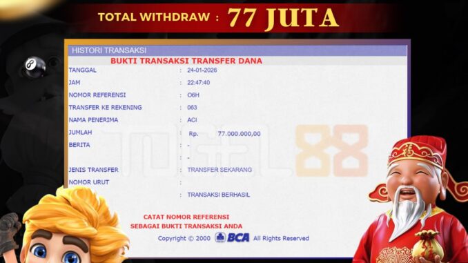 TOGEL88 mengucapkan selamat kepada user id : DIO*** yang telah berhasil mendapatkan jackpot pada permainan SLOT DI SWEET BONANZA. Kemenangan sebesar Rp 77.000.000,-. telah dibayarkan LUNAS oleh pihak TOGEL88 kepada pemilik user id setelah yang bersangkutan mengisi formulir withdraw. Proses pencairan dana berlangsung sangat cepat hanya dalam waktu 5-10 menit sudah berada dalam rekening pemilik user id. Bukti transfer yang dapat anda lihat adalah bukti SAH / VALID yang langsung di dapatkan melalui bukti transaksi dari Bank yang digunakan untuk pengiriman dana pada rekening pemilik user id. Terima kasih kami sampaikan kepada para pengguna setia TOGEL88 yang telah menggunakan situs kami, sebagai Bandar Terpercaya yang pastinya membayar semua kemenangan member hingga lunas. Apakah TOGEL88 PENIPU ? Reputasi “TOGEL88 TERPERCAYA” sudah sangat melekat. puluhan hingga ratusan ribu pengguna setia TOGEL88 tetap menggunakan situs terbesar dan terbaik di Indonesia ini. Hapus rasa was-was dan khawatir anda, kemenangan anda berapapun PASTI dibayarkan hingga lunas.