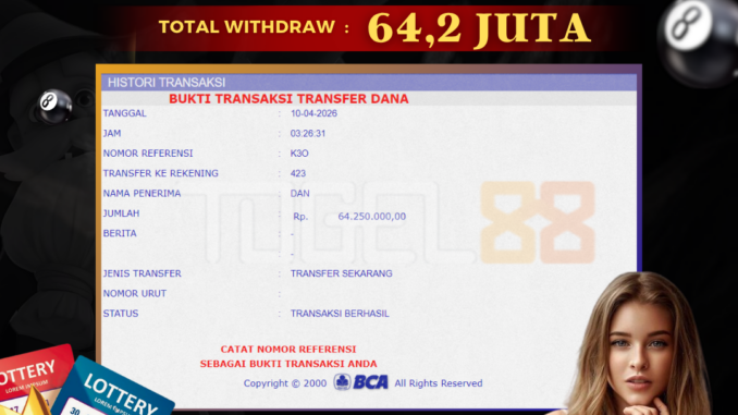 TOGEL88 mengucapkan selamat kepada user id : DAN*** yang telah berhasil mendapatkan jackpot pada permainan TOGEL DI AMAZON LOTTO 4D. Kemenangan sebesar Rp 64.250.000,-. telah dibayarkan LUNAS oleh pihak TOGEL88 kepada pemilik user id setelah yang bersangkutan mengisi formulir withdraw. Proses pencairan dana berlangsung sangat cepat hanya dalam waktu 5-10 menit sudah berada dalam rekening pemilik user id. Bukti transfer yang dapat anda lihat adalah bukti SAH / VALID yang langsung di dapatkan melalui bukti transaksi dari Bank yang digunakan untuk pengiriman dana pada rekening pemilik user id. Terima kasih kami sampaikan kepada para pengguna setia TOGEL88 yang telah menggunakan situs kami, sebagai Bandar Terpercaya yang pastinya membayar semua kemenangan member hingga lunas. Apakah TOGEL88 PENIPU ? Reputasi “TOGEL88 TERPERCAYA” sudah sangat melekat. puluhan hingga ratusan ribu pengguna setia TOGEL88 tetap menggunakan situs terbesar dan terbaik di Indonesia ini. Hapus rasa was-was dan khawatir anda, kemenangan anda berapapun PASTI dibayarkan hingga lunas.