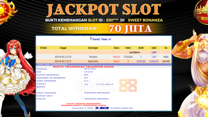 TOGEL88 mengucapkan selamat kepada user id : ERI*** yang telah berhasil mendapatkan jackpot pada permainan SLOT DI SWEET BONANZA. Kemenangan sebesar Rp 70.000.000,-. telah dibayarkan LUNAS oleh pihak TOGEL88 kepada pemilik user id setelah yang bersangkutan mengisi formulir withdraw. Proses pencairan dana berlangsung sangat cepat hanya dalam waktu 5-10 menit sudah berada dalam rekening pemilik user id. Bukti transfer yang dapat anda lihat adalah bukti SAH / VALID yang langsung di dapatkan melalui bukti transaksi dari Bank yang digunakan untuk pengiriman dana pada rekening pemilik user id. Terima kasih kami sampaikan kepada para pengguna setia TOGEL88 yang telah menggunakan situs kami, sebagai Bandar Terpercaya yang pastinya membayar semua kemenangan member hingga lunas. Apakah TOGEL88 PENIPU ? Reputasi “TOGEL88 TERPERCAYA” sudah sangat melekat. puluhan hingga ratusan ribu pengguna setia TOGEL88 tetap menggunakan situs terbesar dan terbaik di Indonesia ini. Hapus rasa was-was dan khawatir anda, kemenangan anda berapapun PASTI dibayarkan hingga lunas.