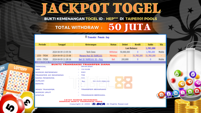 TOGEL88 mengucapkan selamat kepada user id : HEP*** yang telah berhasil mendapatkan jackpot pada permainan TOGEL DI TAIPEI101 POOLS. Kemenangan sebesar Rp 50.000.000,-. telah dibayarkan LUNAS oleh pihak TOGEL88 kepada pemilik user id setelah yang bersangkutan mengisi formulir withdraw. Proses pencairan dana berlangsung sangat cepat hanya dalam waktu 5-10 menit sudah berada dalam rekening pemilik user id. Bukti transfer yang dapat anda lihat adalah bukti SAH / VALID yang langsung di dapatkan melalui bukti transaksi dari Bank yang digunakan untuk pengiriman dana pada rekening pemilik user id. Terima kasih kami sampaikan kepada para pengguna setia TOGEL88 yang telah menggunakan situs kami, sebagai Bandar Terpercaya yang pastinya membayar semua kemenangan member hingga lunas. Apakah TOGEL88 PENIPU ? Reputasi “TOGEL88 TERPERCAYA” sudah sangat melekat. puluhan hingga ratusan ribu pengguna setia TOGEL88 tetap menggunakan situs terbesar dan terbaik di Indonesia ini. Hapus rasa was-was dan khawatir anda, kemenangan anda berapapun PASTI dibayarkan hingga lunas.