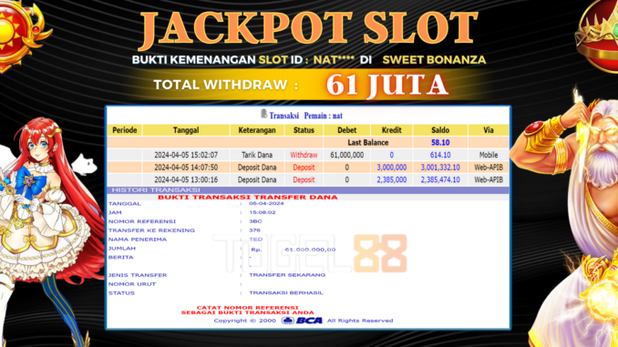 TOGEL88 mengucapkan selamat kepada user id : NAT*** yang telah berhasil mendapatkan jackpot pada permainan SLOT DI SWEET BONANZA Kemenangan sebesar Rp 61.000.000,-. telah dibayarkan LUNAS oleh pihak TOGEL88 kepada pemilik user id setelah yang bersangkutan mengisi formulir withdraw. Proses pencairan dana berlangsung sangat cepat hanya dalam waktu 5-10 menit sudah berada dalam rekening pemilik user id. Bukti transfer yang dapat anda lihat adalah bukti SAH / VALID yang langsung di dapatkan melalui bukti transaksi dari Bank yang digunakan untuk pengiriman dana pada rekening pemilik user id. Terima kasih kami sampaikan kepada para pengguna setia TOGEL88 yang telah menggunakan situs kami, sebagai Bandar Terpercaya yang pastinya membayar semua kemenangan member hingga lunas. Apakah TOGEL88 PENIPU ? Reputasi “TOGEL88 TERPERCAYA” sudah sangat melekat. puluhan hingga ratusan ribu pengguna setia TOGEL88 tetap menggunakan situs terbesar dan terbaik di Indonesia ini. Hapus rasa was-was dan khawatir anda, kemenangan anda berapapun PASTI dibayarkan hingga lunas.