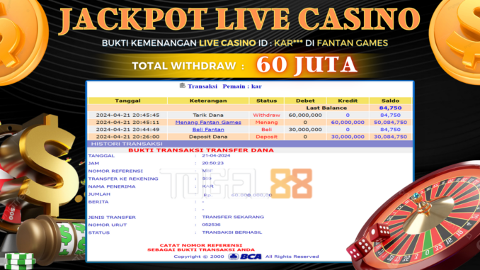 TOGEL88 JACKPOT LIVE CASINO DI FANTAN Rp 60.000.000,- LUNAS