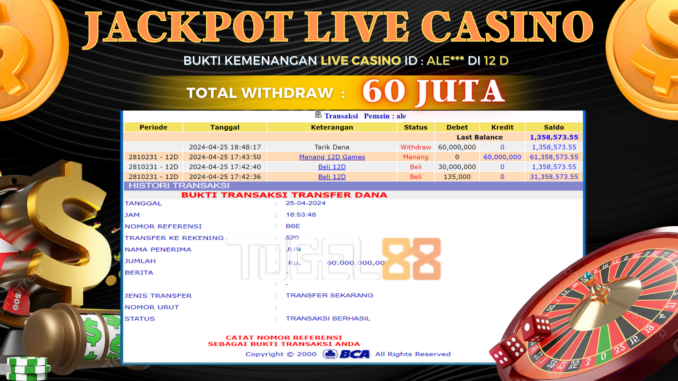 MEMBER TOGEL88 MENERIMA PELUNASAN KEMENANGAN JACKPOT LIVE CASINO DI 12D Rp 60.000.000,- LUNAS