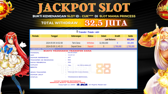 TOGEL88 JACKPOT SLOT DI SLOT MANIA PRINCESS Rp 32.500.000,- LUNAS
