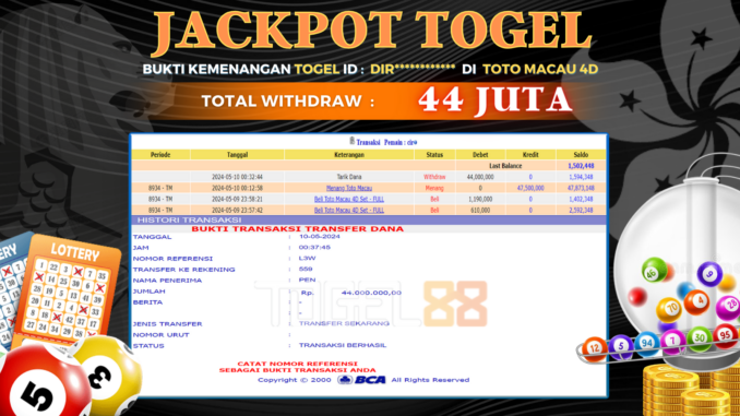 TOGEL88 JACKPOT TOGEL DI TOTO MACAU 4D Rp 44.000.000,- LUNAS