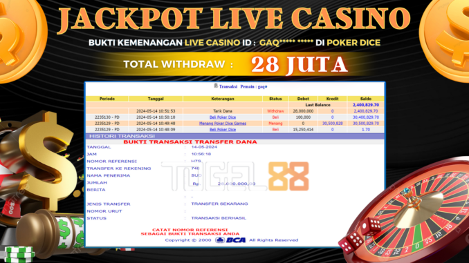 TOGEL88 JACKPOT LIVE CASINO DI POKER DICE Rp 28.000.000,- LUNAS