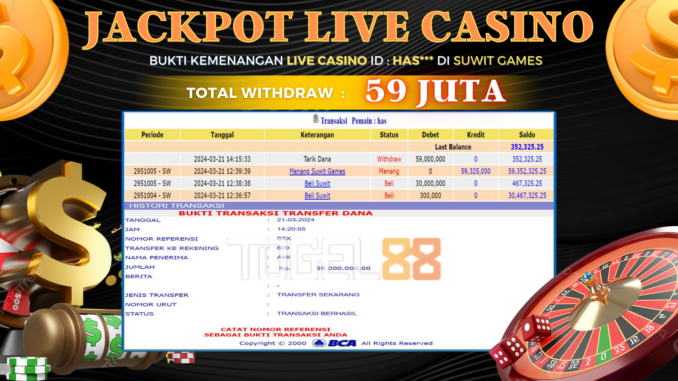 MEMBER TOGEL88 MENERIMA PELUNASAN KEMENANGAN JACKPOT LIVE CASINO DI SUWIT GAMES Rp 59.000.000,- LUNAS