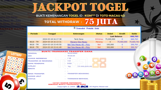 TOGEL88 JACKPOT TOGEL DI TOTO MACAU 4D Rp 75.000.000,- LUNAS