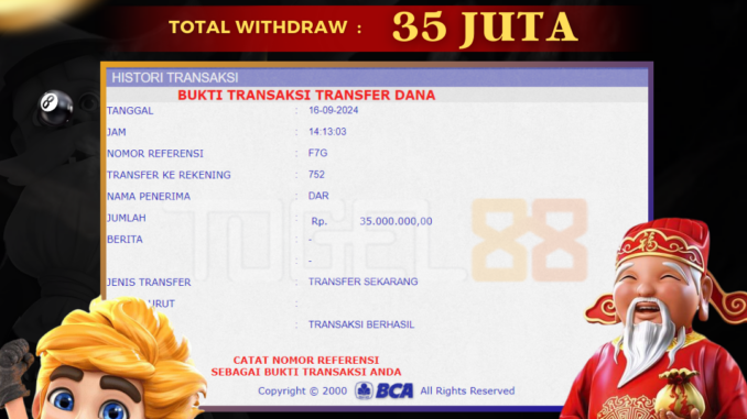 TOGEL88 mengucapkan selamat kepada user id : DAR*** yang telah berhasil mendapatkan jackpot pada permainan SLOT DI SLOT PYRAMID BONANZA. Kemenangan sebesar Rp 35.000.000,-. telah dibayarkan LUNAS oleh pihak TOGEL88 kepada pemilik user id setelah yang bersangkutan mengisi formulir withdraw. Proses pencairan dana berlangsung sangat cepat hanya dalam waktu 5-10 menit sudah berada dalam rekening pemilik user id. Bukti transfer yang dapat anda lihat adalah bukti SAH / VALID yang langsung di dapatkan melalui bukti transaksi dari Bank yang digunakan untuk pengiriman dana pada rekening pemilik user id. Terima kasih kami sampaikan kepada para pengguna setia TOGEL88 yang telah menggunakan situs kami, sebagai Bandar Terpercaya yang pastinya membayar semua kemenangan member hingga lunas. Apakah TOGEL88 PENIPU ? Reputasi “TOGEL88 TERPERCAYA” sudah sangat melekat. puluhan hingga ratusan ribu pengguna setia TOGEL88 tetap menggunakan situs terbesar dan terbaik di Indonesia ini. Hapus rasa was-was dan khawatir anda, kemenangan anda berapapun PASTI dibayarkan hingga lunas.