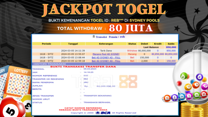 TOGEL88 JACKPOT TOGEL DI SYDNEY POOLS Rp 80.000.000,- LUNAS